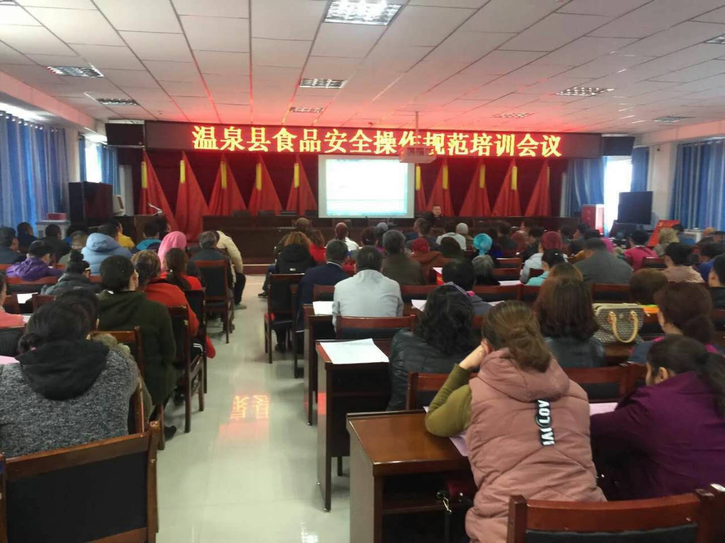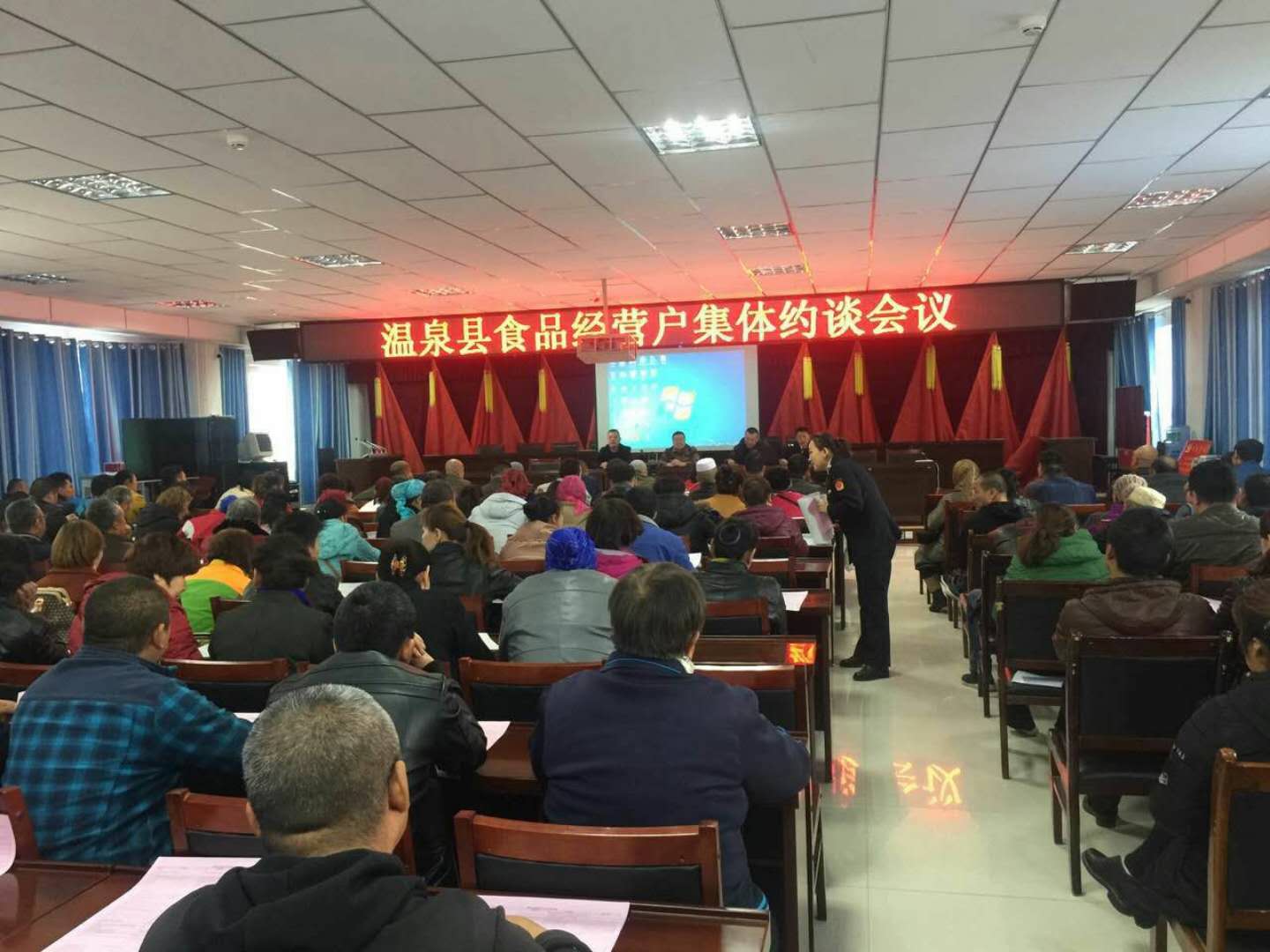 为全面提升全县人民群众饮食安全,促进食品经营企业落实企业主体责任,有效防范食品安全风险隐患,2018年10月16日,温泉县市场监管局邀请博州食品药品监督管理局,组织召开了食品生产经营户集中培训暨食品安全责任集体约谈会议。此次约谈会共培训、约谈食品经营单位377家,签订食品经营企业主体责任书377份。