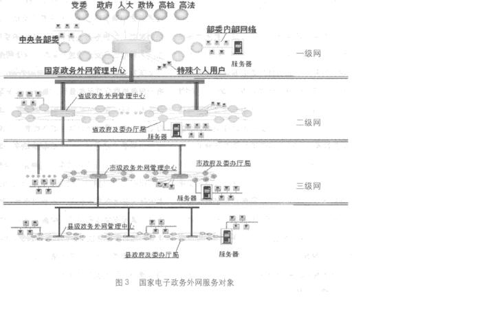 国家政务外网既要作为我国中央和地方各级政府内部的、公用的信息交换平台,又要作为政府面向社会公众提供各种服务的窗口。因此,国家政务外网将服务于中央和地方各级政府的所有部门(参见图3)。