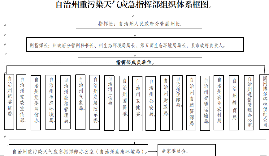 指挥部下设重污染天气应急指挥部办公室(以下简称“指挥部办公室”)。指挥部办公室设在自治州生态环境局,自治州生态环境局局长兼任办公室主任,生态环境局、气象局、第五师双河市生态环境局分管领导担任办公室副主任。