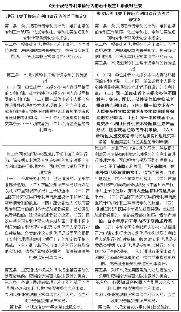 该负责人介绍,征求意见期间,共收到来自32个单位和个人提出的58条意见和建议。经整理、归纳、分析和论证,国家知识产权局采纳了部分意见。在上述工作的基础上,形成了《关于规范专利申请行为的若干规定修改草案(送审稿)》。经局务会审议通过后,2017年2月28日,国家知识产权局正式公布了修改后的《若干规定》。