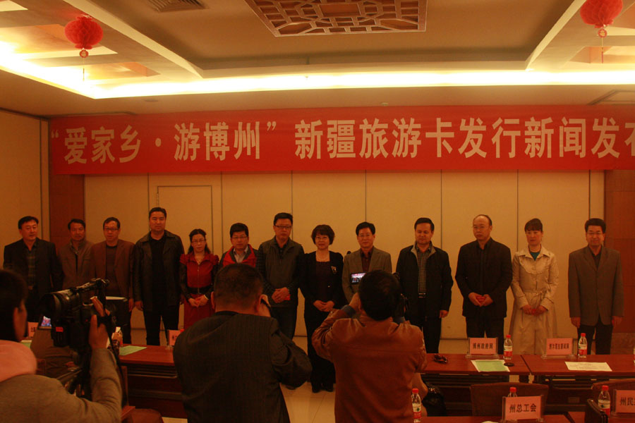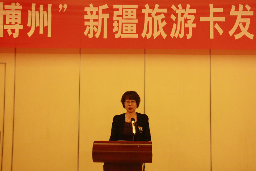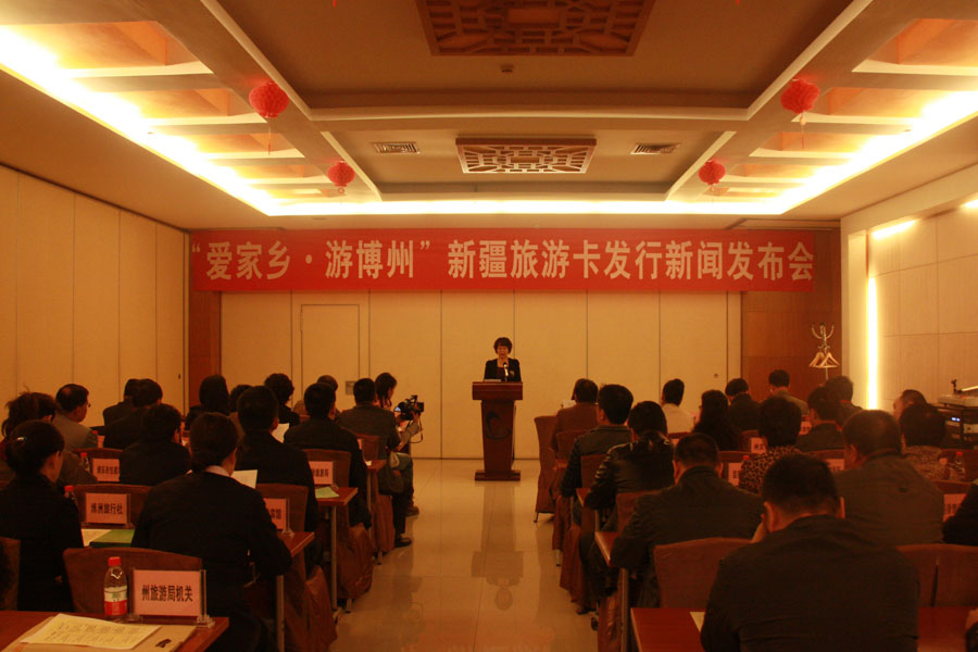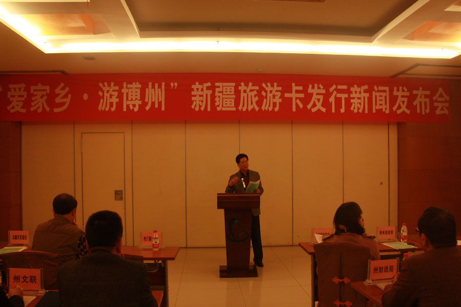 3月27日,博州旅游局在州宾馆举行“爱家乡·游博州”新疆旅游卡发放仪式新闻发布会。发布会由州旅游局局长华定川主持,党组书记单丽萍发布致词。