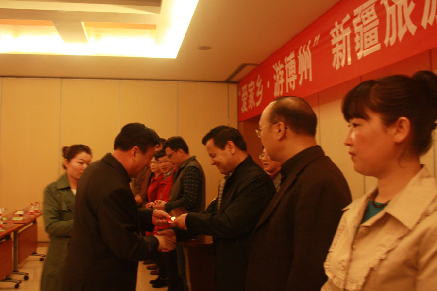 我州旅游卡发放形式有两种,一是各族群众可报名参加州旅游局组织的“魅力博州踏青游”系列活动获得旅游卡,如:博洲旅行社的“春游赛里木”、“怪石峪踏青”、温泉天泉旅行社的“浴温泉观北鲵”等活动;二是通过组织老干部、道德模范、劳动模范、民族团结进步模范、三八红旗手和巾帼建功先进个人、优秀教师、诚信个体工商户、优秀环卫工人、文化艺术界代表200名参加“浴温泉观北鲵”、“赛里木赏花”等活动,发放旅游卡。 (图为参会嘉宾发放旅游卡)