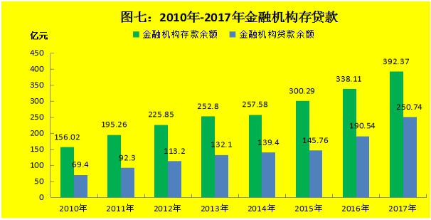 年末全州金融机构各项存款余额392.37亿元,增长16.05%。境内存款392.36亿元,增长16.05%,其中住户存款170.81亿元,增长12.62%;非金融企业存款,86.79亿元,增长17.09%;广义政府存款134.54亿元,增长20.26%;非银行业金融机构存款0.22亿元,下降47.62%。境外存款29.7万元,下降31.71%。年末全州金融机构各项贷款余额250.74亿元,增长31.59%。其中:短期贷款99.12亿元,增长9.96%;中长期贷款136.36亿元,增长48.31%。境内贷款250.74亿元,增长31.59%,其中住户贷款79.43亿元,增长4.97%;非金融企业及机关团体贷款171.31亿元,增长49.13%。
