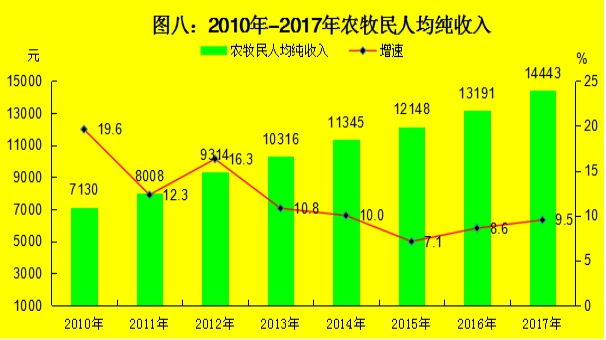 城镇居民人均可支配收入29235元,增长8.2%。农牧民人均纯收入14443元,增加1252元,增长9.5%。