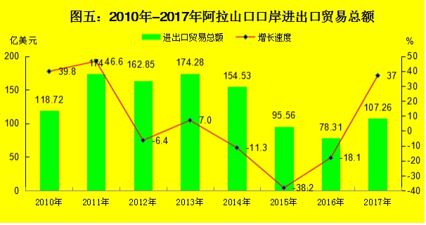 阿拉山口口岸全年进出口货物2112.5万吨,增长19%。进出口贸易总额107.26亿美元,增长37%。其中:进口77.67亿美元,增长34%;出口29.59亿美元,增长45.5%。上缴关税及进口环节税88.79亿元,增长36.8%。全州注册企业进出口货物总额8.56亿美元,增长43.4%,其中:进口总额3.73美元,增长18%;出口总额4.83亿美元,增长78%。