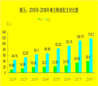 地方财政支出118.2亿元,增长7.6%,一般公共预算支出105.9亿元,下降0.5%。其中,节能环境保护支出8.16亿元,增长1.8倍,城乡社区事务支出10.67亿元,增长56.8%,社会保障和就业支出12.35亿元,增长21.1%,科学技术支出2亿元,增长10.9%,一般公共服务支出9.13亿元,下降8.3%。