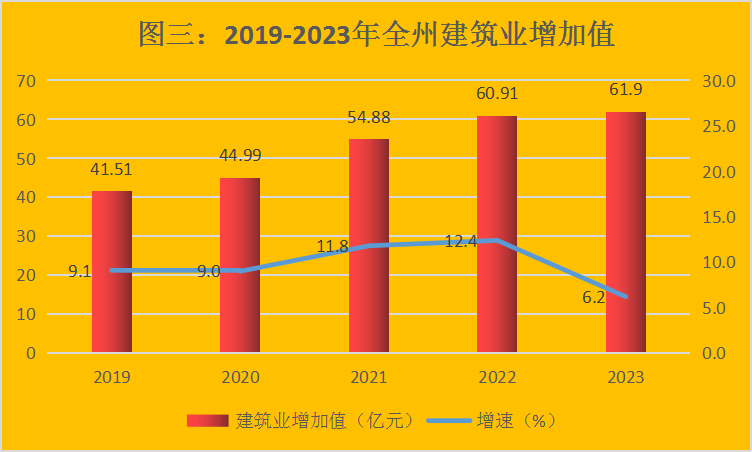 全年全州建筑业增加值61.9亿元,比上年增长6.2%。地方本地注册建筑业企业实现建筑业总产值64.19亿元、增长24.6%。从构成看,建筑工程产值完成62.74亿元、增长25.7%,占总产值的97.7%;安装产值完成1.45亿元、增长13.7%,占总产值的2.3%。