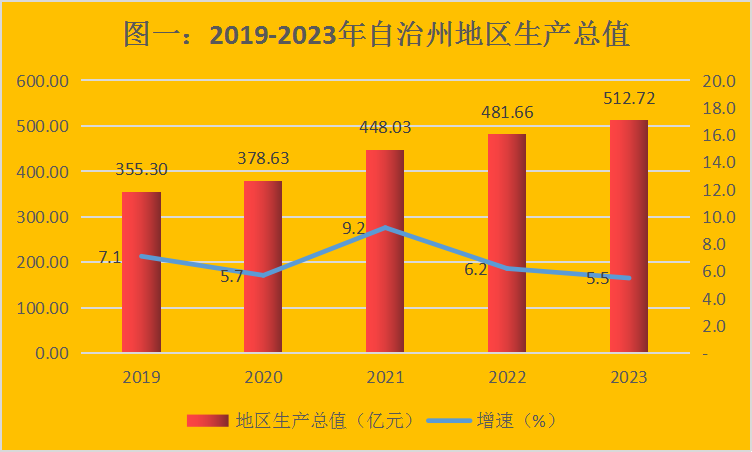 根据地区生产总值统一核算结果,全州地区生产总值512.72亿元,按可比价计算,比上年增长5.5%。分产业看,第一产业增加值113.15亿元,增长7.5%,占地区生产总值的22.1%;第二产业增加值153.65亿元,增长2.0%,占地区生产总值的30.0%;第三产业增加值245.92亿元,增长6.7%,占地区生产总值的47.9%。