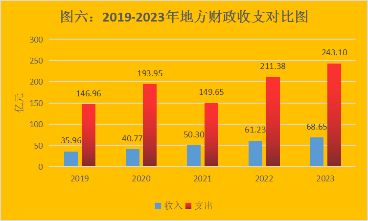 全年地方财政支出243.1亿元,比上年增长14.6%。一般公共预算支出159.58亿元、增长11.6%。其中,一般公共服务支出12.12亿元、下降8.9%;公共安全支出7.24亿元、下降16.1%;教育支出21.09亿元、下降0.7%;科学技术支出2.49亿元、下降1.1%;文化旅游体育与传媒支出3.40亿元、增长12.3%;社会保障和就业支出11.34亿元、增长6.0%;卫生健康支出12.35亿元、增长14.6%;节能环保支出8.15亿元、增长3.8%;城乡社区支出14.02亿元、增长47.5%;农林水支出38.25亿元、增长91.0%;交通运输支出6.85亿元、下降40.4%%;资源勘探信息等支出1.81亿元、下降48.3%;住房保障支出5.63亿元、增长7.6%。政府性基金预算支出83.39亿元、增长20.9%。