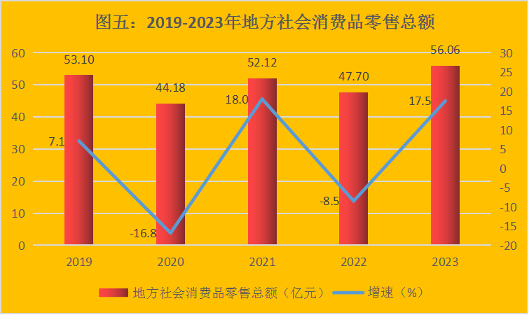 全年地方社会消费品零售总额56.06亿元,比上年增长17.5%。按城乡划分,城镇消费品零售额49.08亿元、增长26.6%;乡村消费品零售额6.97亿元、下降21.8%。按行政区域分,博乐市社会消费品零售总额39.69亿元、增长17.5%;阿拉山口市社会消费品零售总额1.55亿元、增长14.0%;精河县社会消费品零售总额10.85亿元、增长19.3%;温泉县社会消费品零售总额3.96亿元、增长14.3%。按消费形态分,餐饮收入4.98亿元、增长55.8%;商品零售51.07亿元、增长14.8%。