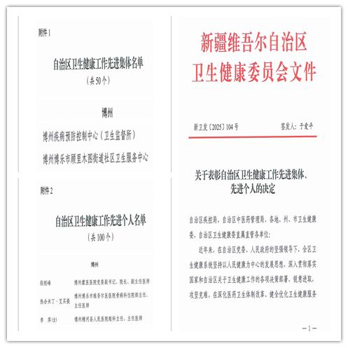 近日,自治区卫生健康委员会印发《关于表彰自治区卫生健康工作先进集体、先进个人的决定》,对在全区卫生健康事业发展中作出显著贡献的单位和个人进行表彰。博州卫生健康系统在此次评选中取得佳绩,共有2个集体和3名个人获得自治区级荣誉,充分展现了博州卫生健康工作者的专业素养与使命担当。
