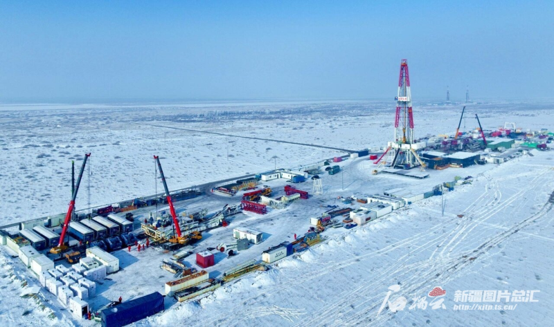 1月24日,中国石油集团西部钻探工程有限公司准东钻井公司70088钻井队员工在吉木萨尔页岩油JHW81号平台安装钻井设备。周建玲摄