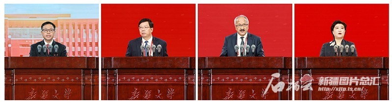 9月21日,在庆祝新疆大学建校100周年大会上,新疆大学党委书记代斌、清华大学党委书记邱勇、吉尔吉斯斯坦比什凯克国立大学校长穆萨耶夫·阿卜杜尔达、新疆大学校友代表王蓁分别致辞(由左至右)。石榴云/新疆日报记者 崔志坚摄