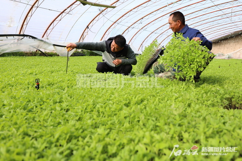 2023年4月17日,新疆生产建设兵团第五师86团一家种植专业合作社大棚育苗基地里,农技人员指导社员管护蔬菜苗。吕羡林摄