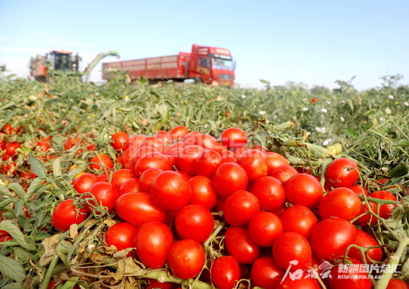 2024年8月15日,在新疆生产建设兵团第六师101团一块农田里,职工采用机械收获加工番茄。魏新江摄