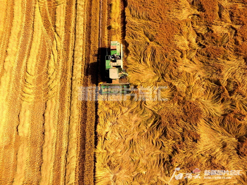 2016年10月11日,新疆生产建设兵团第一师原阿拉尔农场职工在收割水稻。王志清摄
