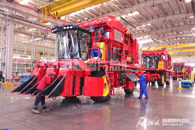 2024年3月12日,工人在位于五家渠市的新疆天鹅现代农业机械装备有限公司采棉机生产线上生产采棉机。李华北摄