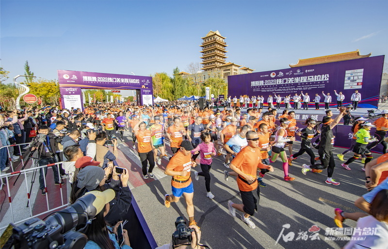 2023年10月15日,博斯腾·2023铁门关半程马拉松在新疆生产建设兵团第二师丝路雄关景区鸣枪开赛。李嘉成摄