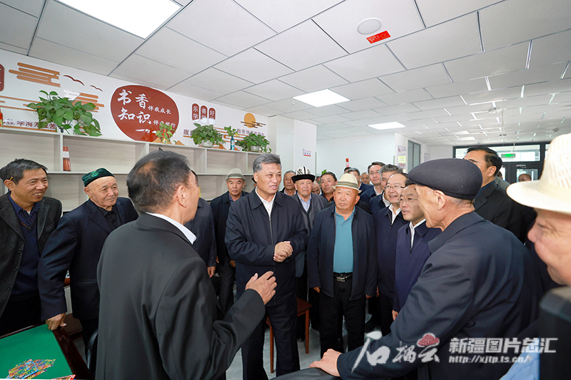 10月9日,自治区党委书记马兴瑞在阿图什市光明街道玛纳斯社区日间照料服务中心,与居民亲切交流,关切询问他们生活、康养等情况。天山网-新疆日报记者 崔志坚摄