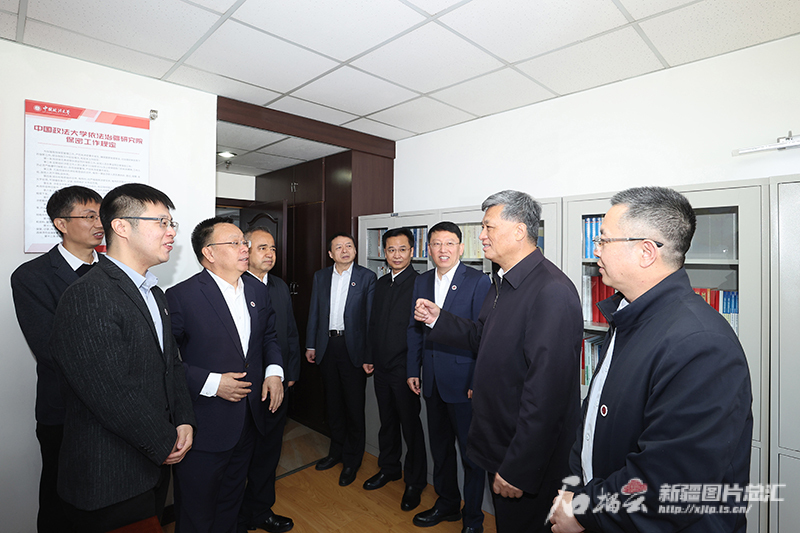 4月21日,自治区党委书记马兴瑞,自治区党委副书记、自治区主席艾尔肯·吐尼亚孜等在中国政法大学依法治疆研究院,察看了解办公场所、团队建设等情况。石榴云/新疆日报记者 崔志坚摄
