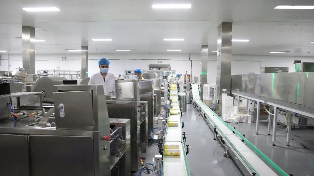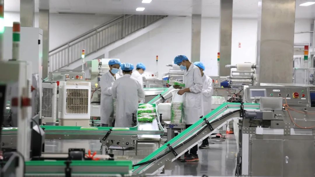 在金沙河面业有限责任公司生产车间,机器轰鸣,工人们身着整洁的工作服,戴着口罩,忙碌而有序地操作着设备,一片热火朝天的生产景象。