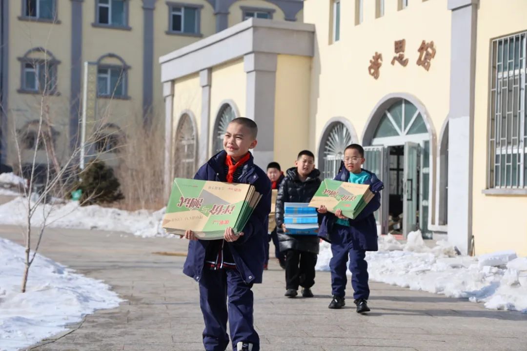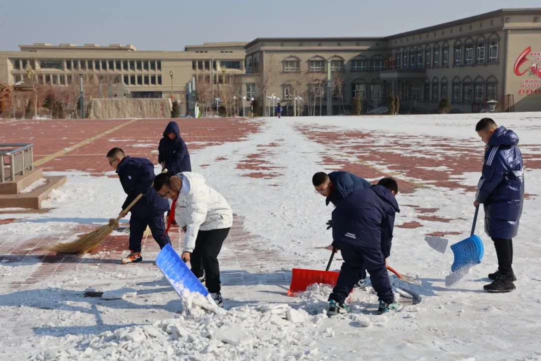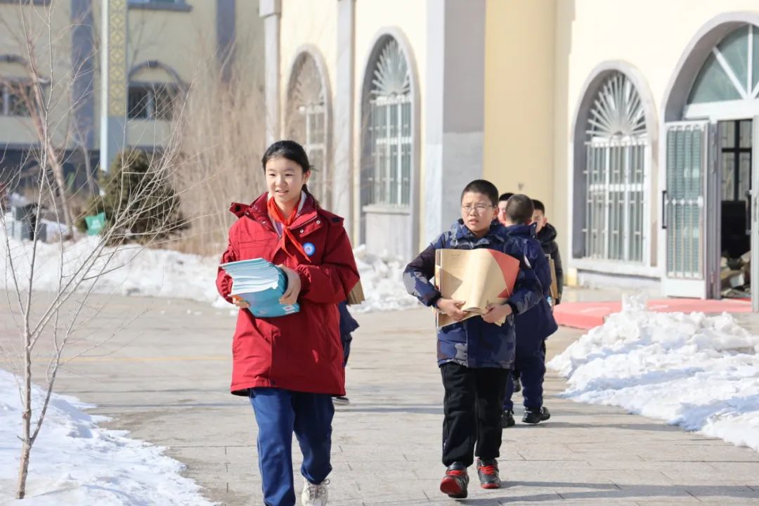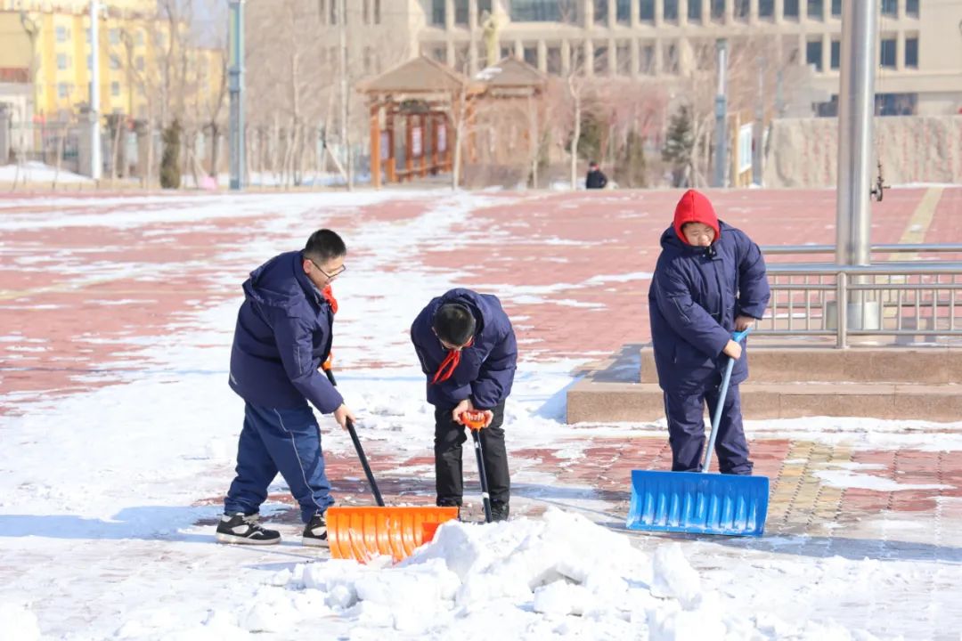 刚刚回到校园的孩子们,除了在宿舍打扫卫生、收拾床铺、整理内务,还加入到了校园扫雪除冰的队伍中,与老师共同守护校园安全。