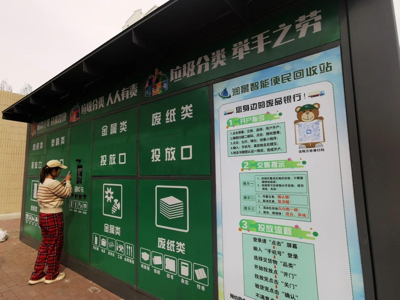 克尔根卓街道西环社区的锦绣b区居民张琼月正在往回收箱里“投喂”垃圾,她先在屏幕上选择投递类型,然后微信扫码登录,待箱门打开后完成垃圾投递,环保金实时到账,整个过程不超过五分钟。