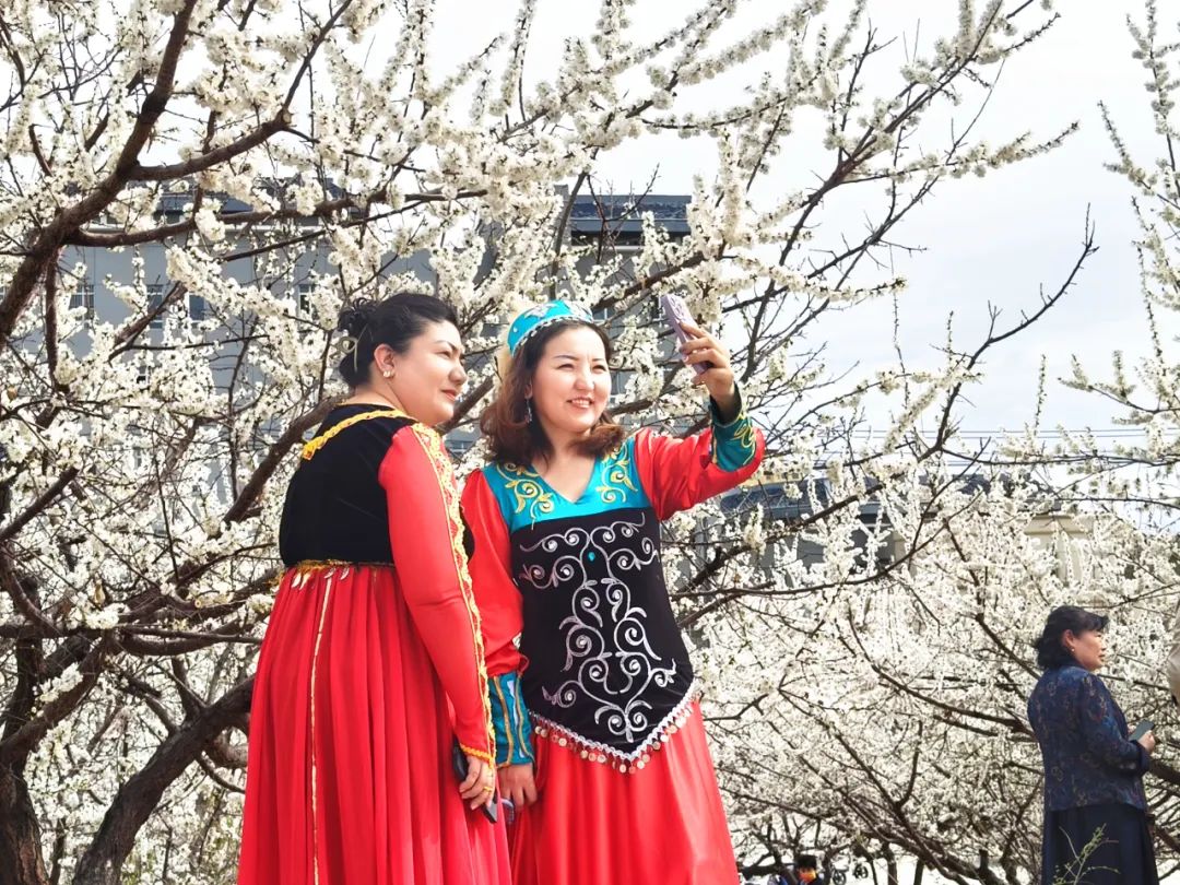 开满枝头的杏花,成为了摄影爱好者的“早春模特”,纷纷用相机记录春日的美景。居民也置身花海中,赏花留影。“听说这里的杏花开了,今天我约了几个好姐妹来打卡游玩。精河县还有很多美丽的风景,以后我们会逐一去打卡,通过我们的视角来宣传推介美丽精河。”居民吾丽帕·赛比提汗。“