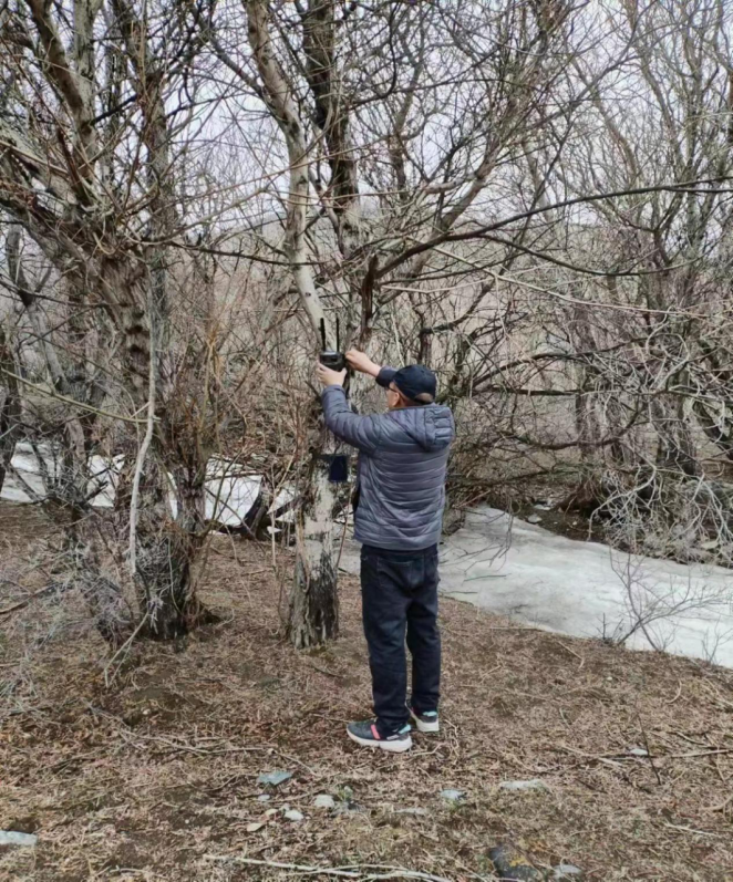 新疆北鲵自然保护区管理站工作人员在保护区河谷林布设红外相机