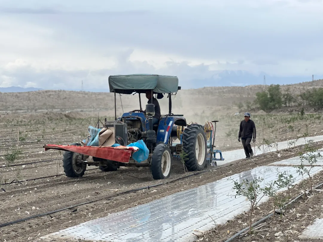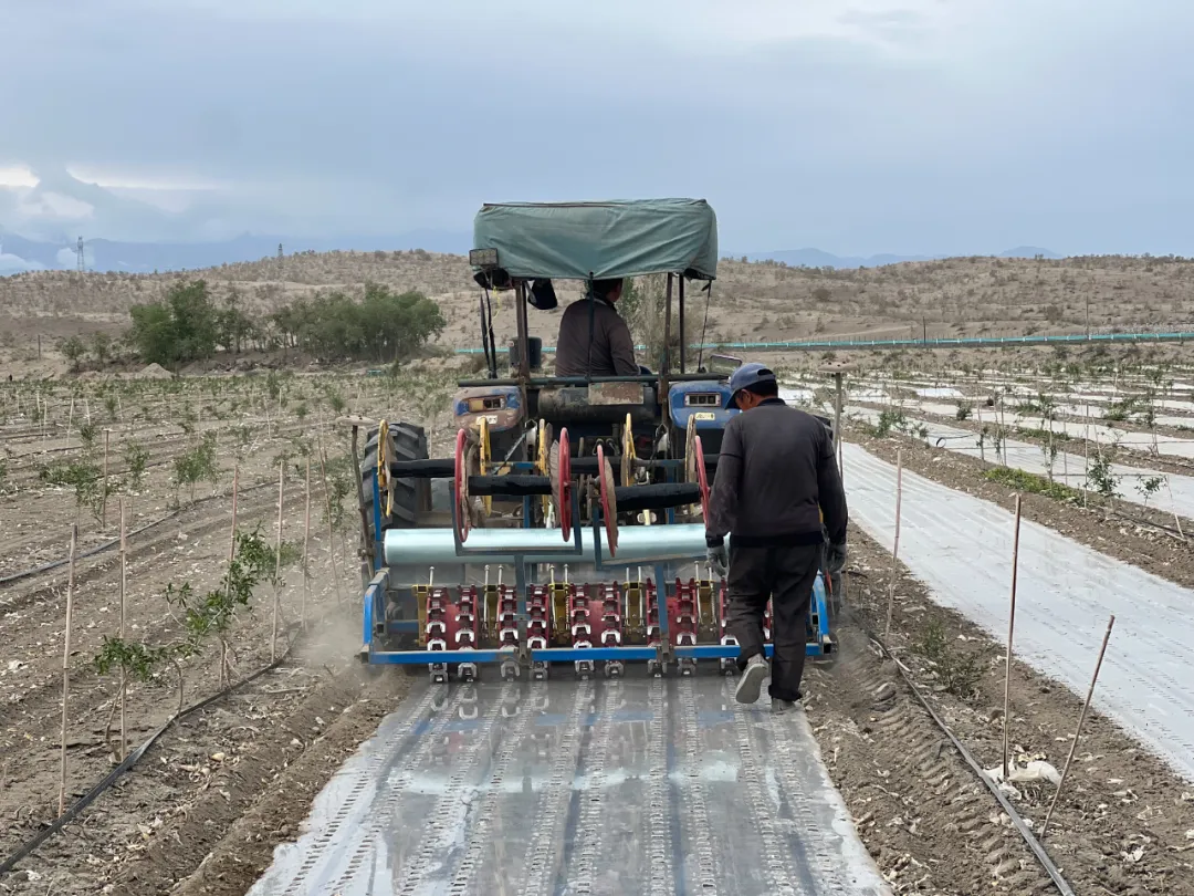 5月7日,在精河县托里镇吾夏克巴依东村种植户马忠山的枸杞地里,两台板蓝根播种机在田地里交替作业,整地、施肥、播种、覆膜、铺设滴灌带,伴随着机器的轰鸣,一粒粒板蓝根种子播进了土壤。天气晴好,马忠山额头渗出细密的汗珠,但难掩喜悦的心情,他说:“今年套种300亩板蓝根,两台机子同时作业,预计3天就可以种完。”
