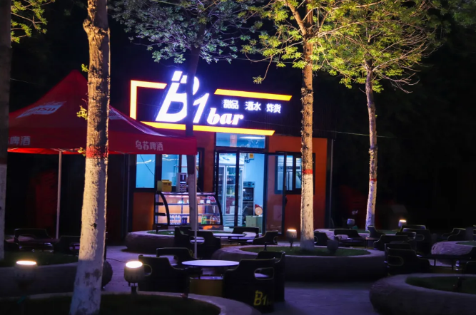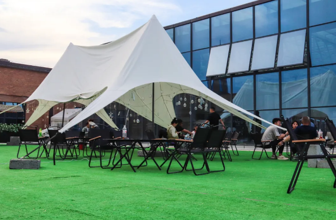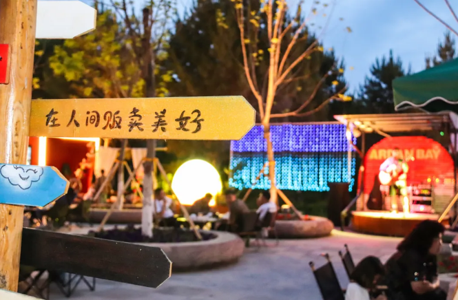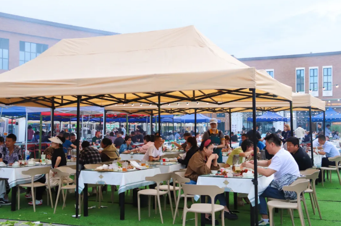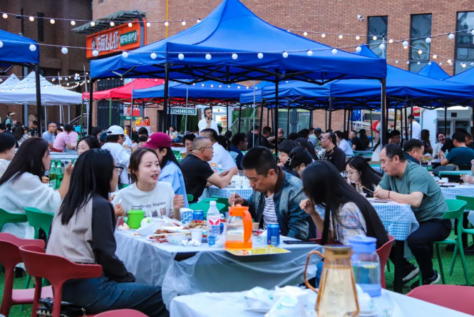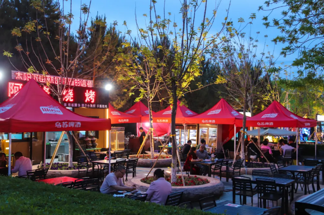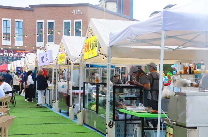 今年,为了打造优质的夜市打卡点,大巴扎露营美食广场依托位于天台的优势,打造了集美食广场和露营酒馆为一体的露营风新型美食夜市。