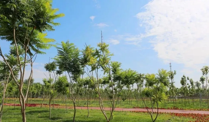 该区域原为戈壁丘陵荒地,地质以砾石为主,造林立地条件差,树木难以成长,后经专家论证,决定利用工程废方及建筑垃圾堆山造园,形成一个小型山丘,可登高望远。