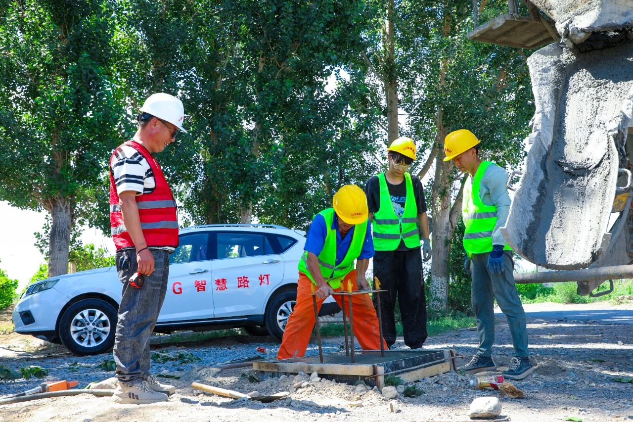 近日,在托里镇大庄子村路口,大型商混车正在工作人员的引导下有序放料,工人们也在对现浇的混凝土进行震动、抹平,随后放入钢筋骨架、找平,现场施工井然有序。