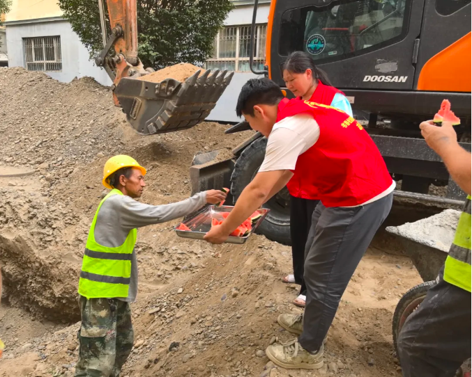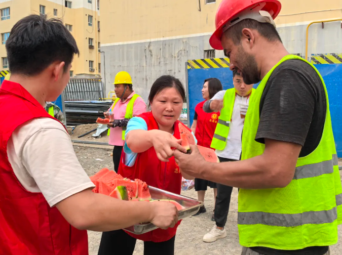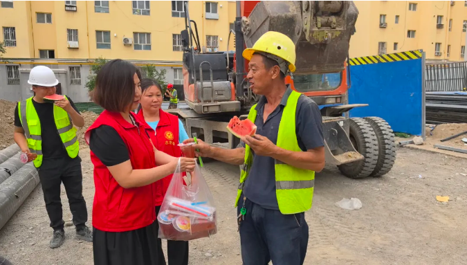 青得里街道和平社区为在高温下坚持的一线工作者送去了爱心礼包、西瓜、矿泉水等物品,为他们送去了丝丝清凉。