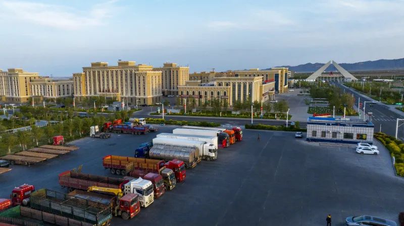 在阿拉山口口岸跨境电子商务分拣清关中心,一辆辆满载货物的集卡车在各企业仓库装卸货物。