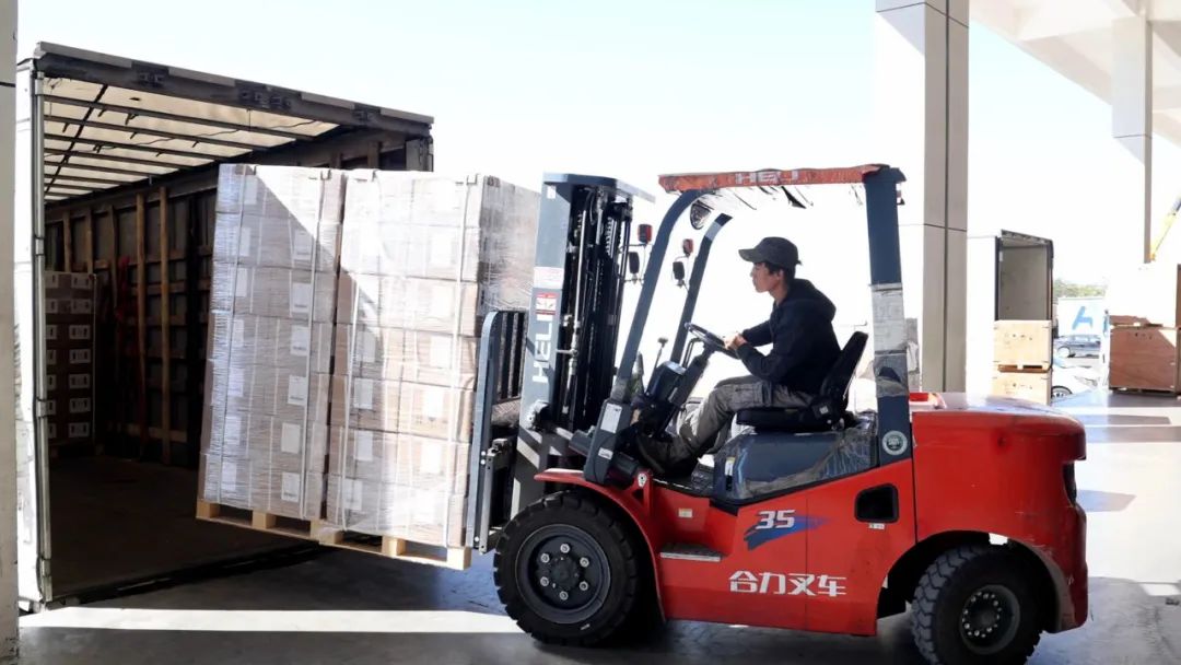 工人正在驾驶叉车装卸跨境货物。布仁巴特 摄