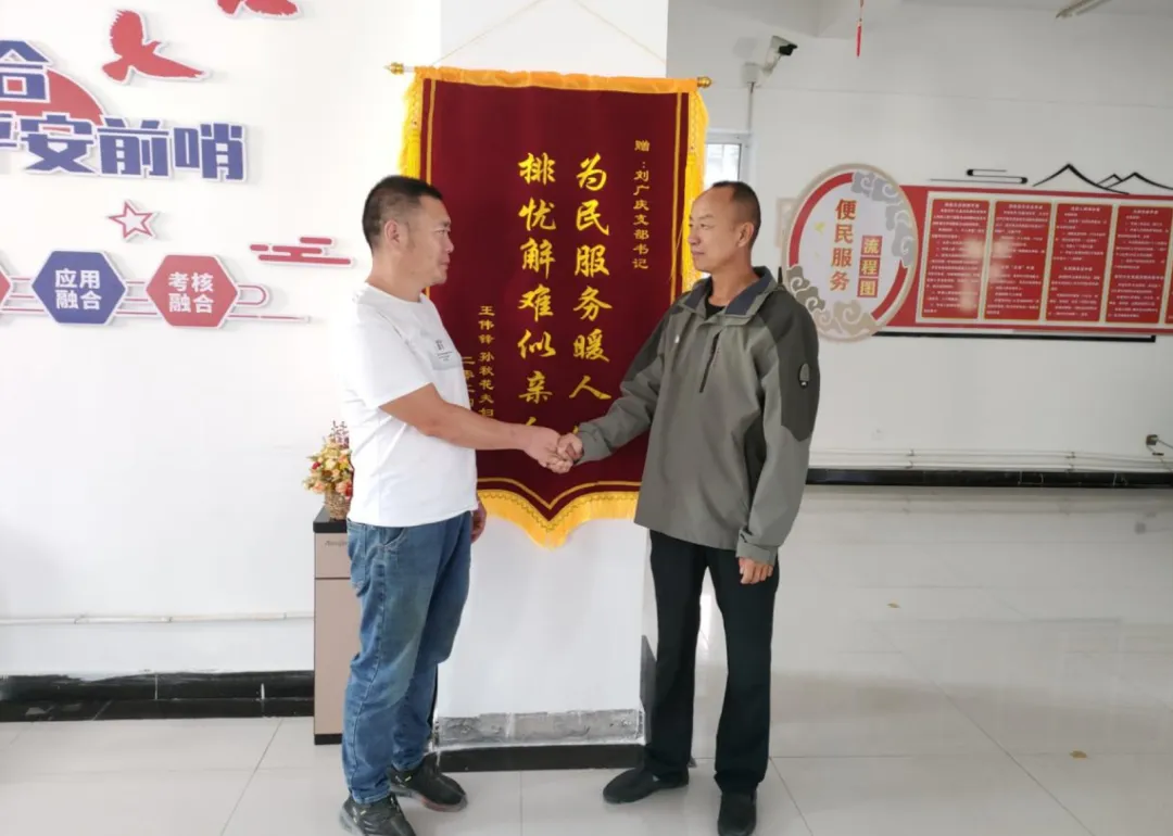 图为:2024年8月30日,八家户农场农四队党支部为群众解决急难愁盼问题,居民送来锦旗表示感谢。