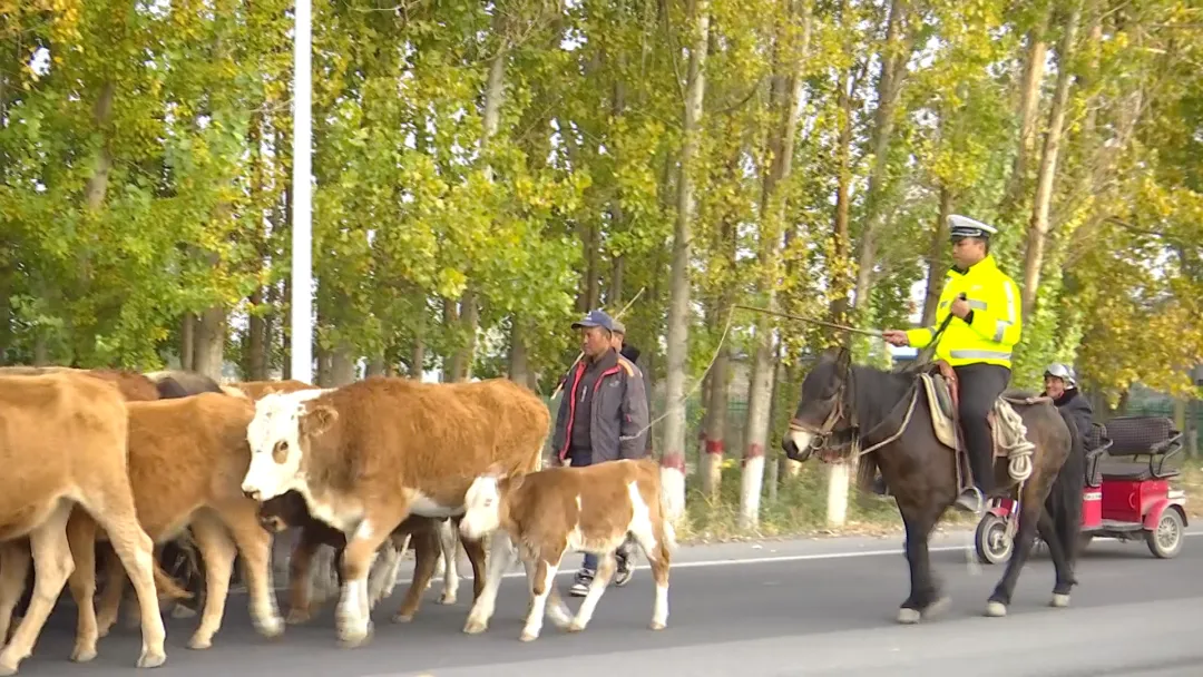 10月24日,在精河县环城路上,茫丁乡肖乃村牧民塔吉阿洪·赛来阿洪的30余头牛群在精河交警的贴心守护下,正赶往肖乃村定居点。交警热那提一边忙着维护现场秩序,一边指挥疏导车辆和牛羊群,同时提醒道路上的驾驶人员减速慢行、安全行车。塔吉阿洪·赛来阿洪感慨地说:“今天特别感谢精河县公安局交警大队的同志们,路上车特别多,我们几个人忙不过来。交警同志来从环城路护送到肖乃村路口,过了路口我们就到家了。”