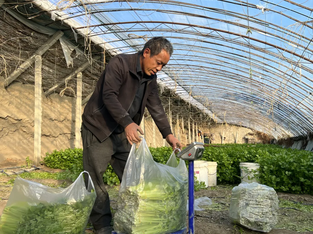 在茫丁乡新庄村蔬菜种植基地,一座座大棚整齐排列在田间。走进种植户张立峰的棚内,满眼翠绿,毛芹的清新气息扑面而来。他正忙着铲芹菜、剪根、打捆、过称,准备销往周边市场。