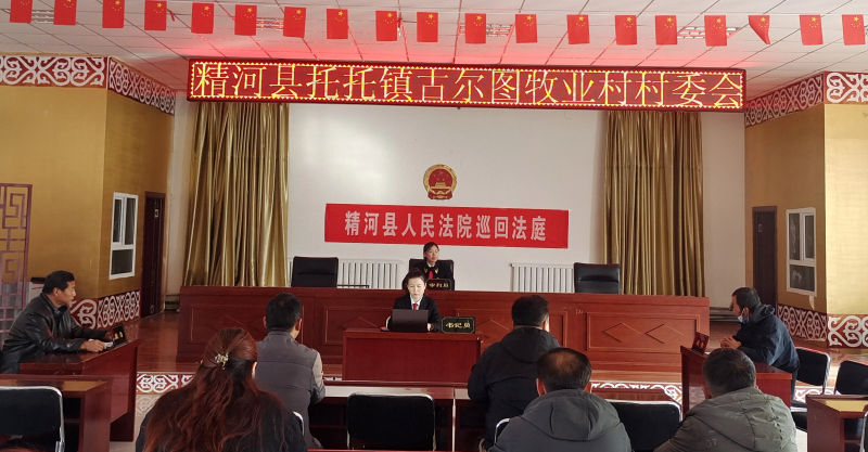 挂起国徽,摆好桌签,打上字幕,一个简易又不失庄严的法庭就这样“搬”进精河县托托镇古尔图牧业村村委会。近日,精河县人民法院民事审判庭通过巡回审判方式审理了一起案件。