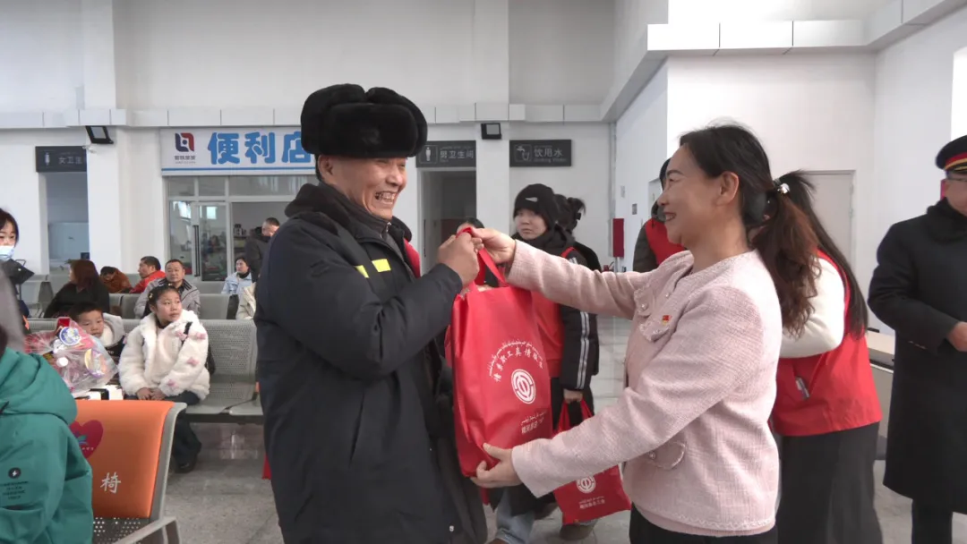当日,精河县总工会开展 “温暖回家路 工会伴你行” 送温暖活动。工作人员前往候车大厅,为等候返乡的农民工送上新春祝福,并精心准备了包含方便面、馕、牛奶、水果、春联等物资的 “温暖大礼包”,让返乡农民工感受到关爱与温暖。