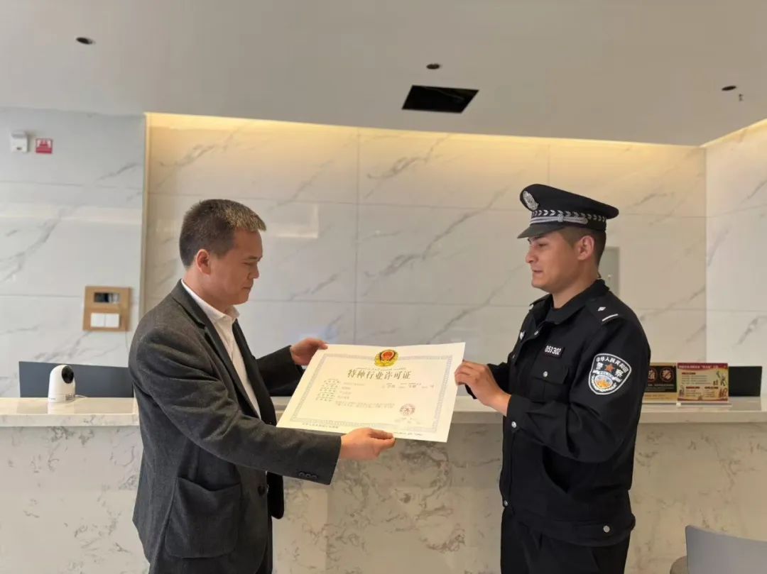 同时,为进一步压缩审批时限,市公安局治安大队联合艾比湖镇派出所,对辖区新申请酒店实行 “提前介入、主动服务” 机制。民警在企业提交申请前即开展安全检查,现场指出消防设施、治安防范等方面的问题,并提供整改方案;同时,一次性告知所需材料,指导规范填报。在辖区内某酒店申请过程中,民警通过现场办公完成材料审核、整改验收等环节,当天下午即完成许可证核发,并第一时间送证上门,实现 “申请即受理、受理即办结”。
