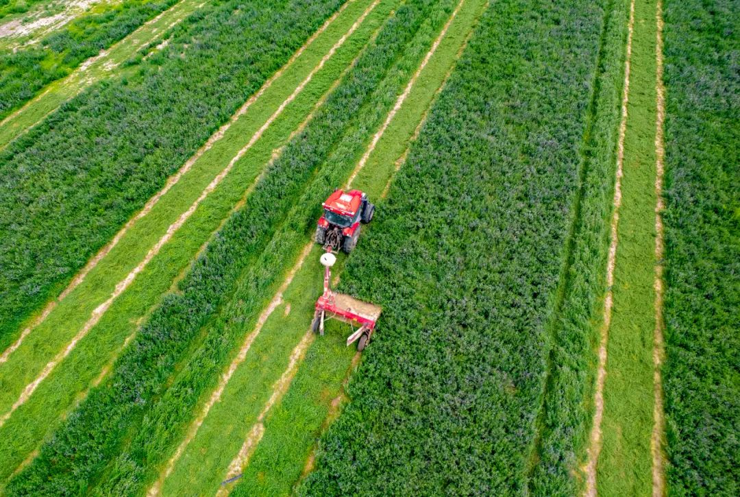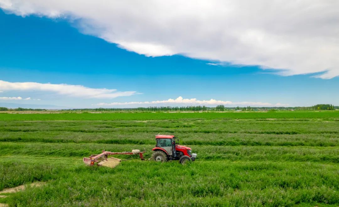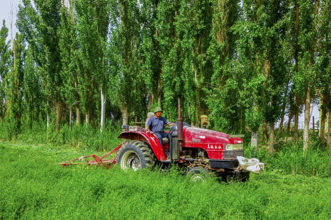 与此同时,在茫丁乡哈尔托热村,种植户阿玛斯别克・塔斯甫拉提家的苜蓿地里同样绿意盎然、清香四溢。小型收割机在田间穿梭,高效有序地完成收割工作。