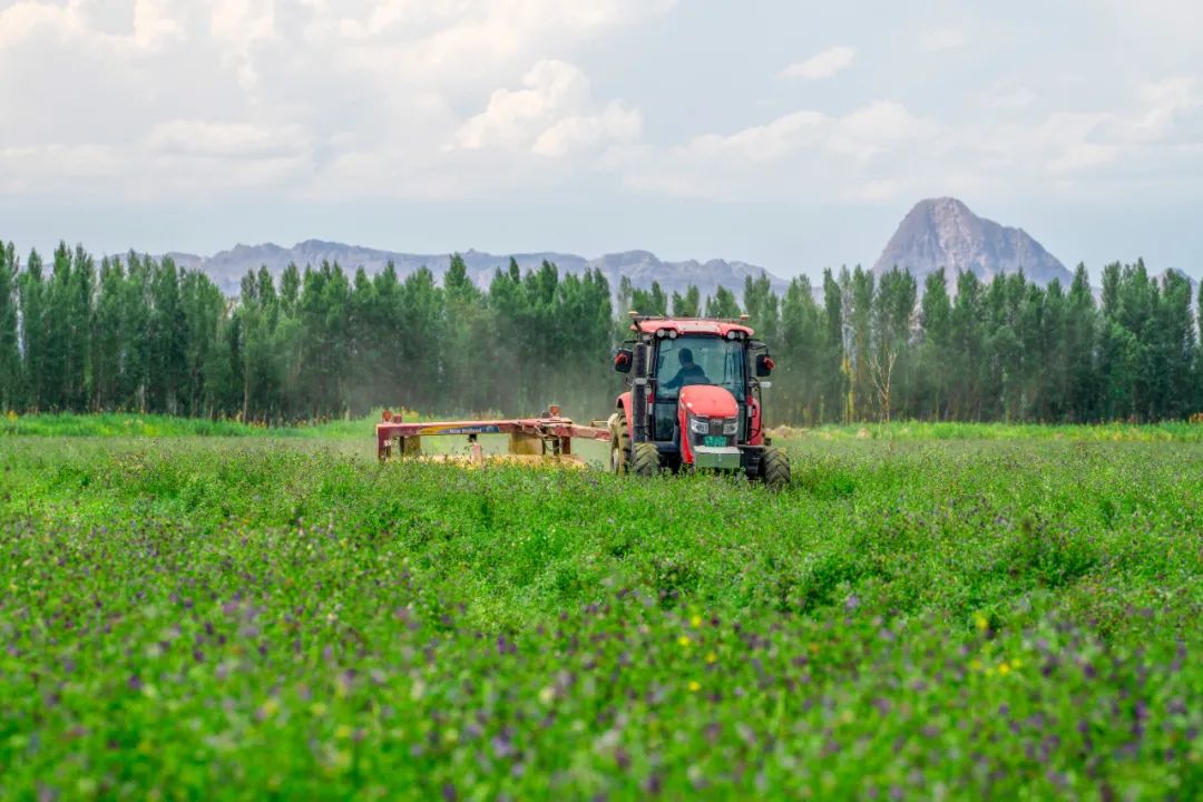 在大河沿子镇乌什布拉克村紫花苜蓿种植基地,收割机、搂草机、打捆机等大型机械来回穿梭作业,将成片翠绿的苜蓿收割、打捆,一辆辆满载苜蓿的拉运车辆在田埂间来回奔波。