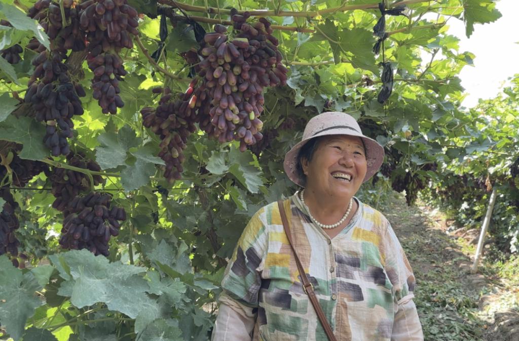 8月6日,在种植户刘桂清的葡萄采摘园,成片的藤架上缀满圆润饱满的葡萄,吸引了许多游客前来采摘。游客刘亮亮说:“今天带孩子们来葡萄园,这里葡萄品种多、甜度高,价格实惠,可以‘自助’采摘,体验感很不错。”