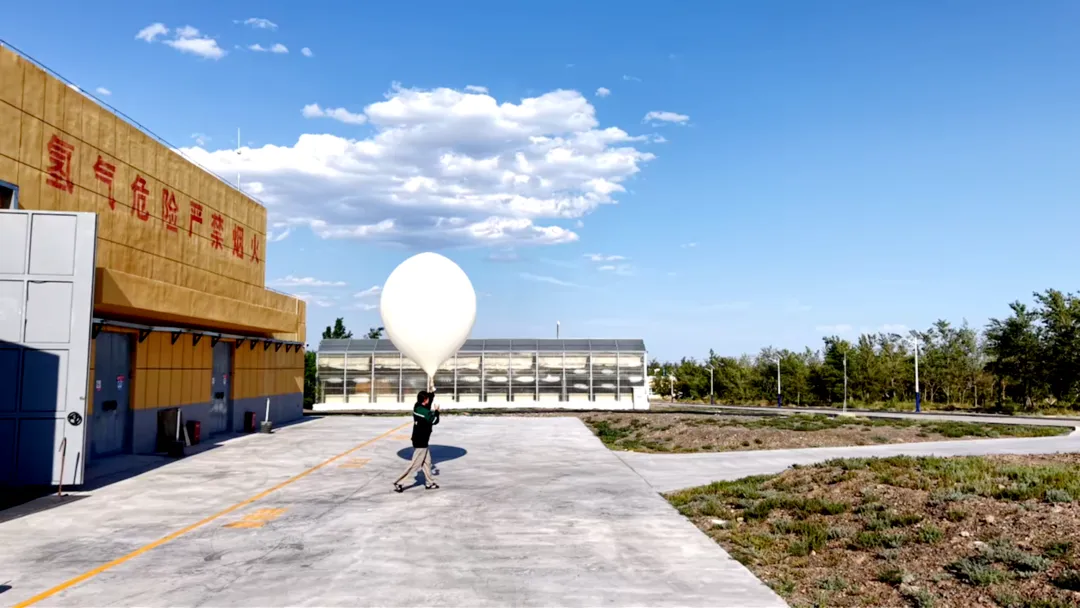 阿拉山口市气象局工作人员准备放飞探空气球。