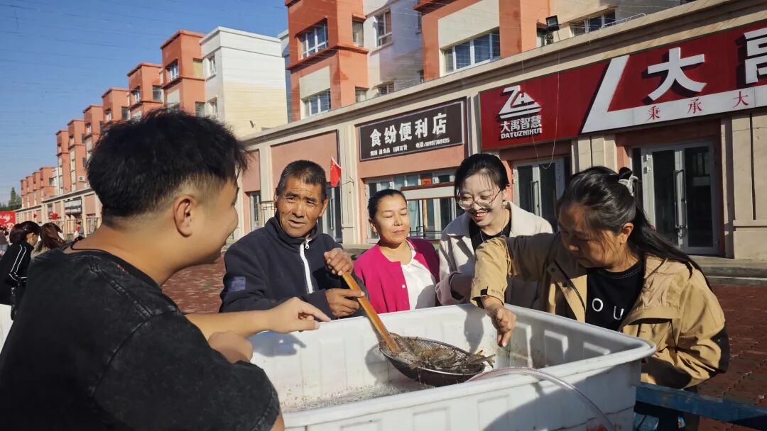 活动现场,农副产品售卖区热闹非凡。农户们带着自家的“丰收成果”早早到场,地里新鲜采摘的苦瓜翠绿饱满、南瓜敦实可爱、西红柿红润鲜亮,被整齐码放在竹筐中;笼里的鸡鸭鹅不时扑棱着翅膀,尽显生机;水盆里的鲜虾鲜活蹦跳,溅起细碎的水花。每一样农产品都带着泥土的芬芳与“原生态”的新鲜,引得往来群众驻足挑选。
