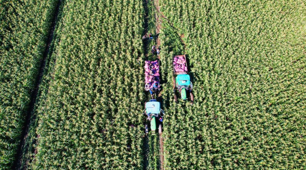走进赵昌的玉米地,翠绿的玉米叶随风摆动,饱满的果穗裹着金黄的苞叶,工人们正熟练地掰下玉米、装袋,一派丰收景象。