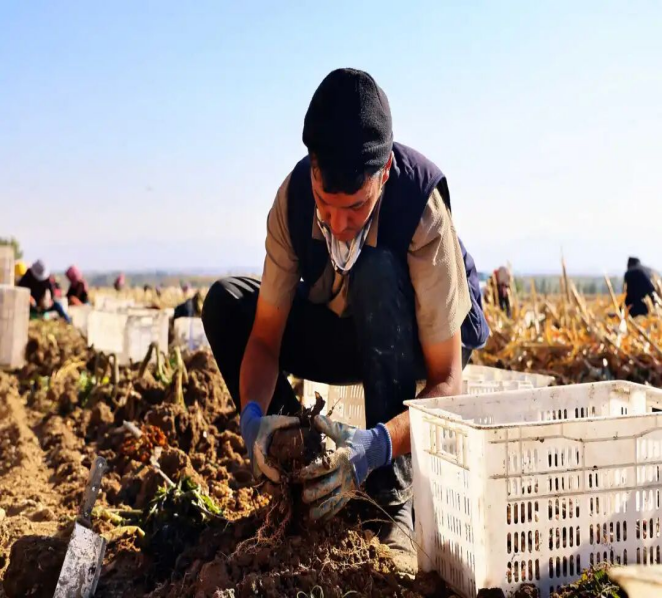 金秋时节,硕果飘香。在温泉县查干屯格乡的 2000 多亩魔芋种植基地里,成片的魔芋植株郁郁葱葱、长势喜人,饱满的魔芋球茎静静埋藏在肥沃土壤里,等待采收,处处洋溢着丰收的喜悦。连日来,种植户们趁着晴朗天气,在田间忙着开挖、分拣、搬运魔芋,田间地头随处可见他们忙碌的身影,丰收的喜悦在每个人的脸上绽放。