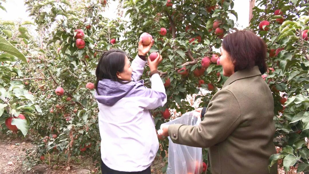 除了梨枣园,茫丁乡城关村种植户董桂芝的苹果园同样人气十足。走进果园,成排的苹果树整齐挺立,饱满的红富士苹果挂满枝头,红润诱人,不少消费者专程前来,边采边尝,感受秋日里的丰收喜悦。
